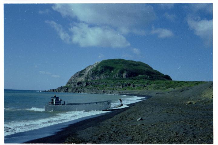 | A JSDF landing craft with Mount Suribachi in the background. |